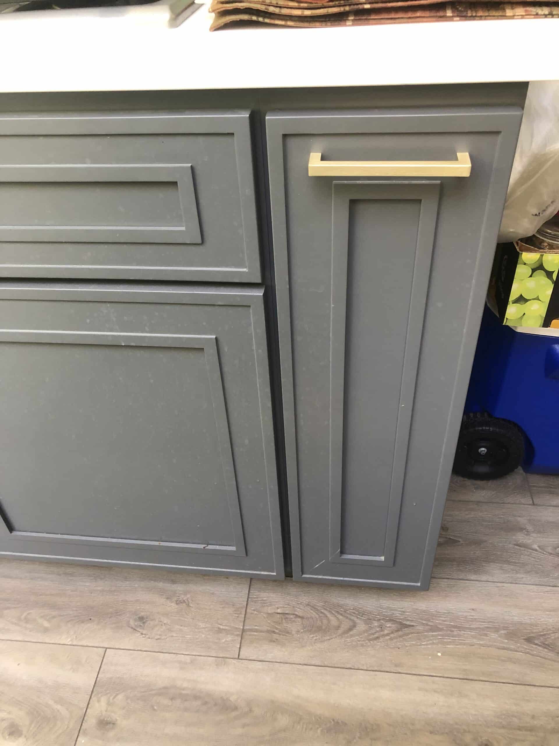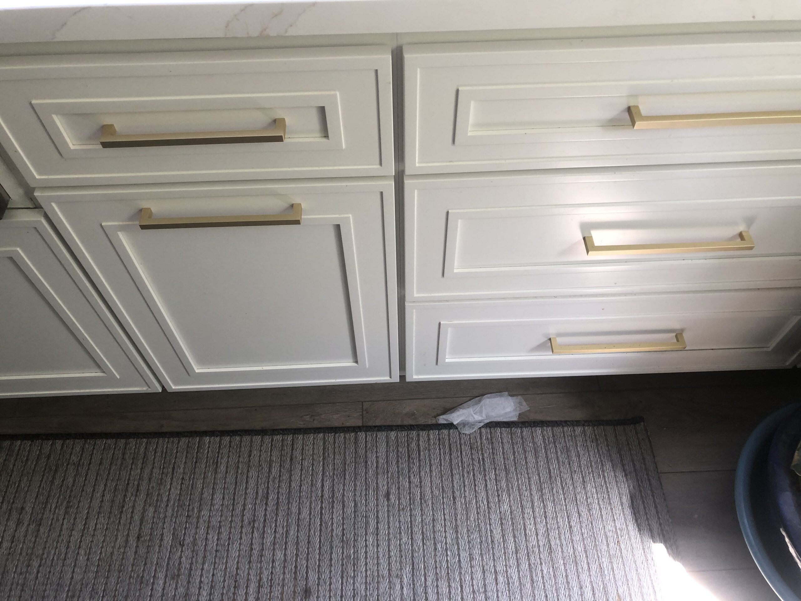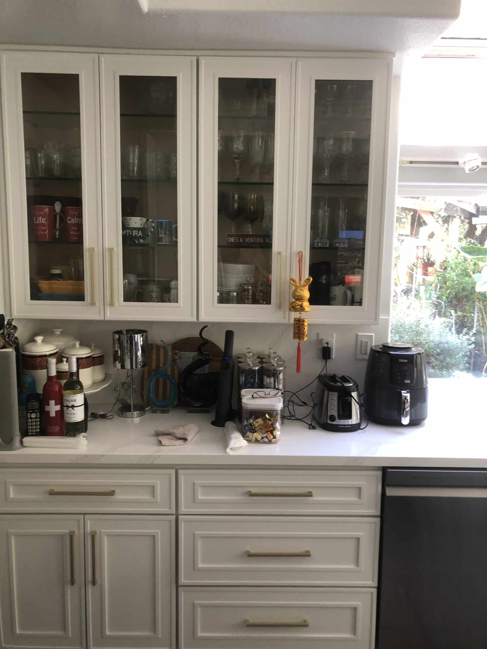 To enhance functionality and style, we included several kitchen accessories, such as a farmhouse sink, scribe molding, knob/pulls installation, glass cabinet doors, and specialized storage solutions like a spice rack and roll-out trays.
