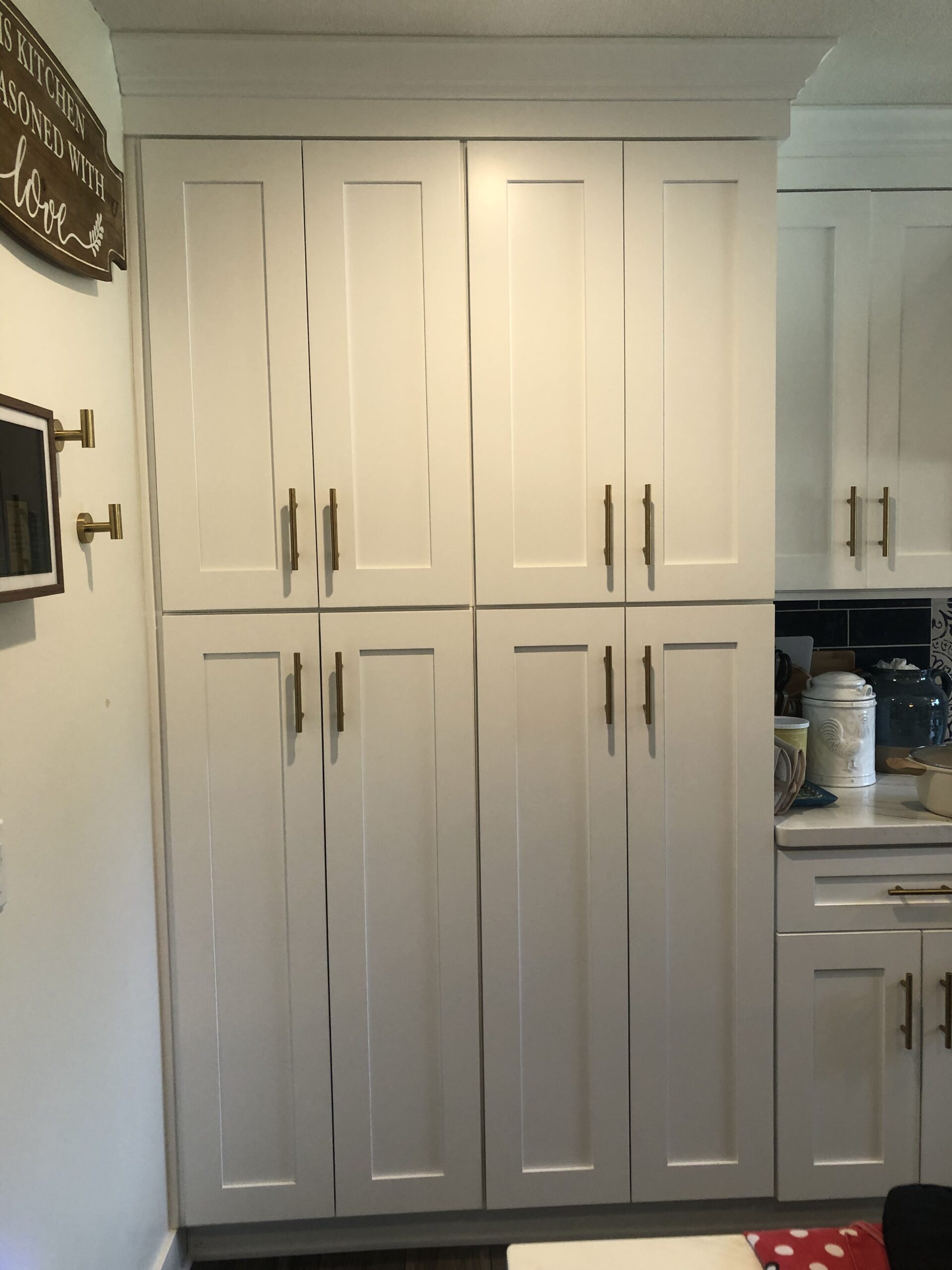 Functional and stylish kitchen accessories included roll-out trays, a farmhouse sink, a spacious pantry, crown molding, knob/pulls installation, and a fridge panel for a seamless finish.